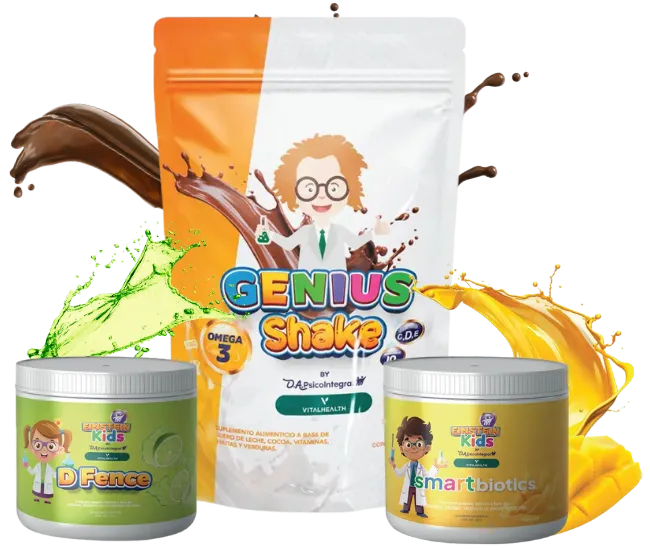 Los suplementos alimenticios de la línea Einstein Kids (Genius Shake, D-FENCE Kids y Smartbiotics) son productos diseñados para complementar la nutrición infantil y no sustituyen una dieta equilibrada ni un estilo de vida saludable.